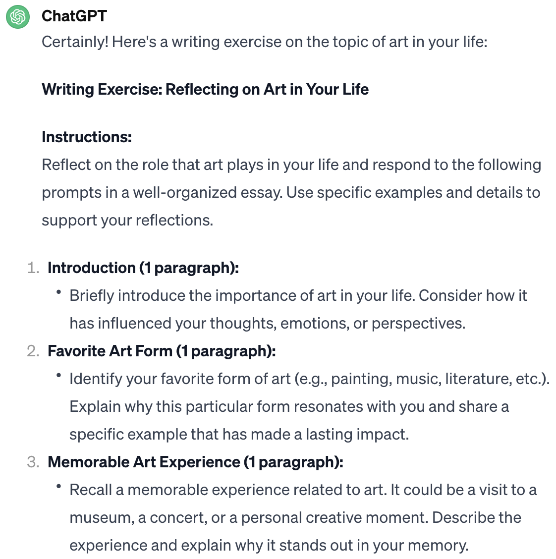 При обучении письменной речи учитель может запросить чат-бот сгенерировать темы для эссе или составить образец письма, приглашения, подкаста, книги рецептов. Это поможет учащимся улучшить навыки письма и орфографии. Например, Can you create a writing exercise on the topic of (your topic), Write a letter about (your topic).